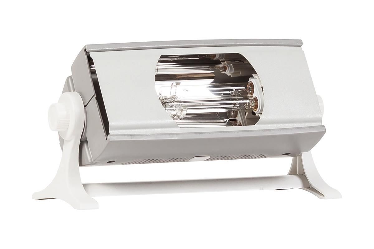 Лампа расположена в удобном корпусе на ножках, для различных частей тела имеется три типа трубчатых насадок, а также защитные очки, чтобы во время процедуры ультрафиолетовые лучи не попадали на роговицу глаза. Корпус лампы поворотный – может подниматься вверх и опускаться вниз. Лампой можно проводить кварцевание помещения площадью 25-30 кв.м.