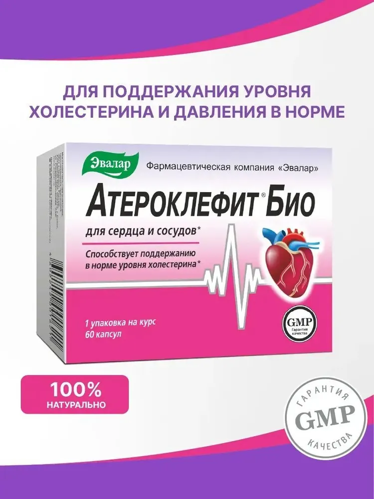БАД Эвалар Атерокдефит БИО помогает поддерживать нормальный уровень холестерина, улучшать состояние сосудов, снижать артериальное давление и снижать риск атеросклероза.