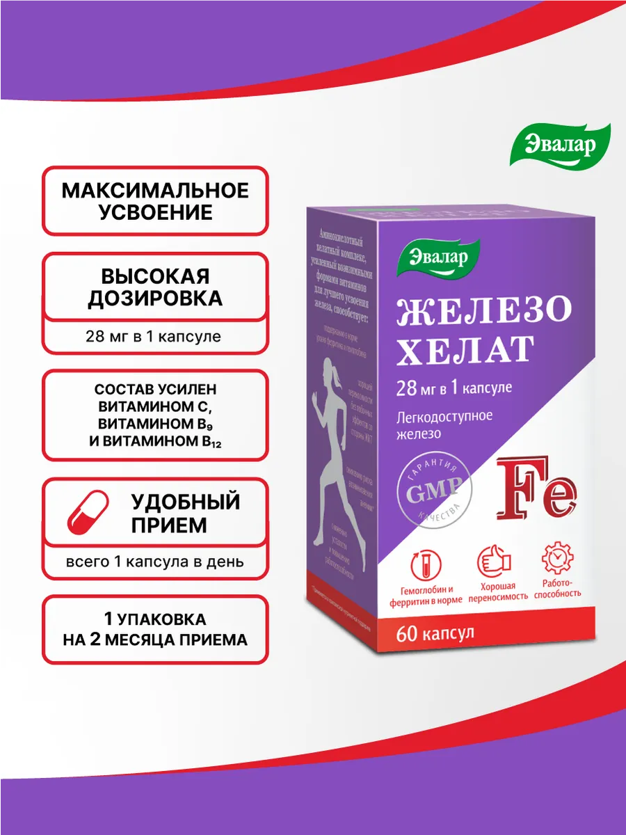 БАД Эвалар Железо Хелат 250 мг № 60 (таблетки) для восполнения дефицита железа, для энергии, снижения усталости и поддержки кроветворения купить в Минске по доступной цене