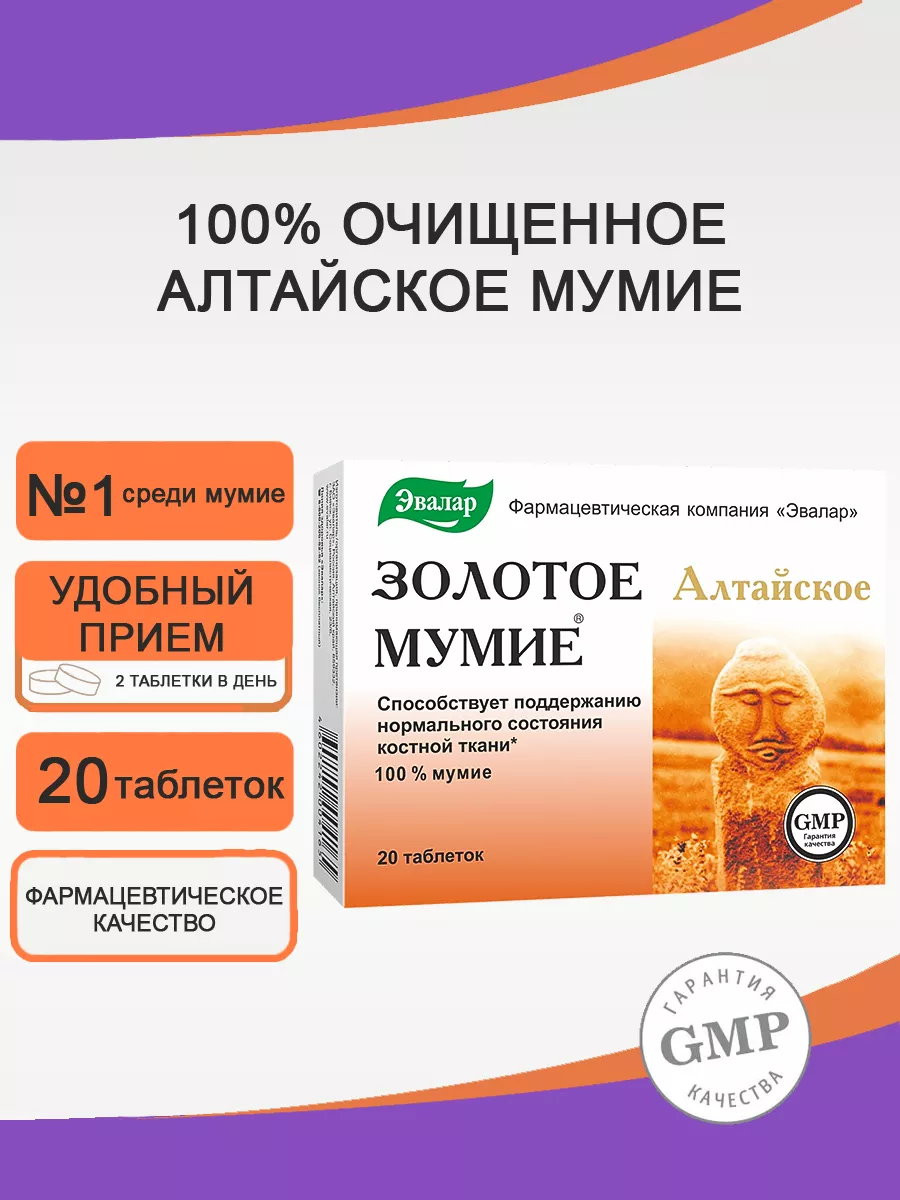 БАД Эвалар Золотое Мумие алтайское очищенное 200 мг № 20 (таблетки), для костей и суставов, для регенерации тканей