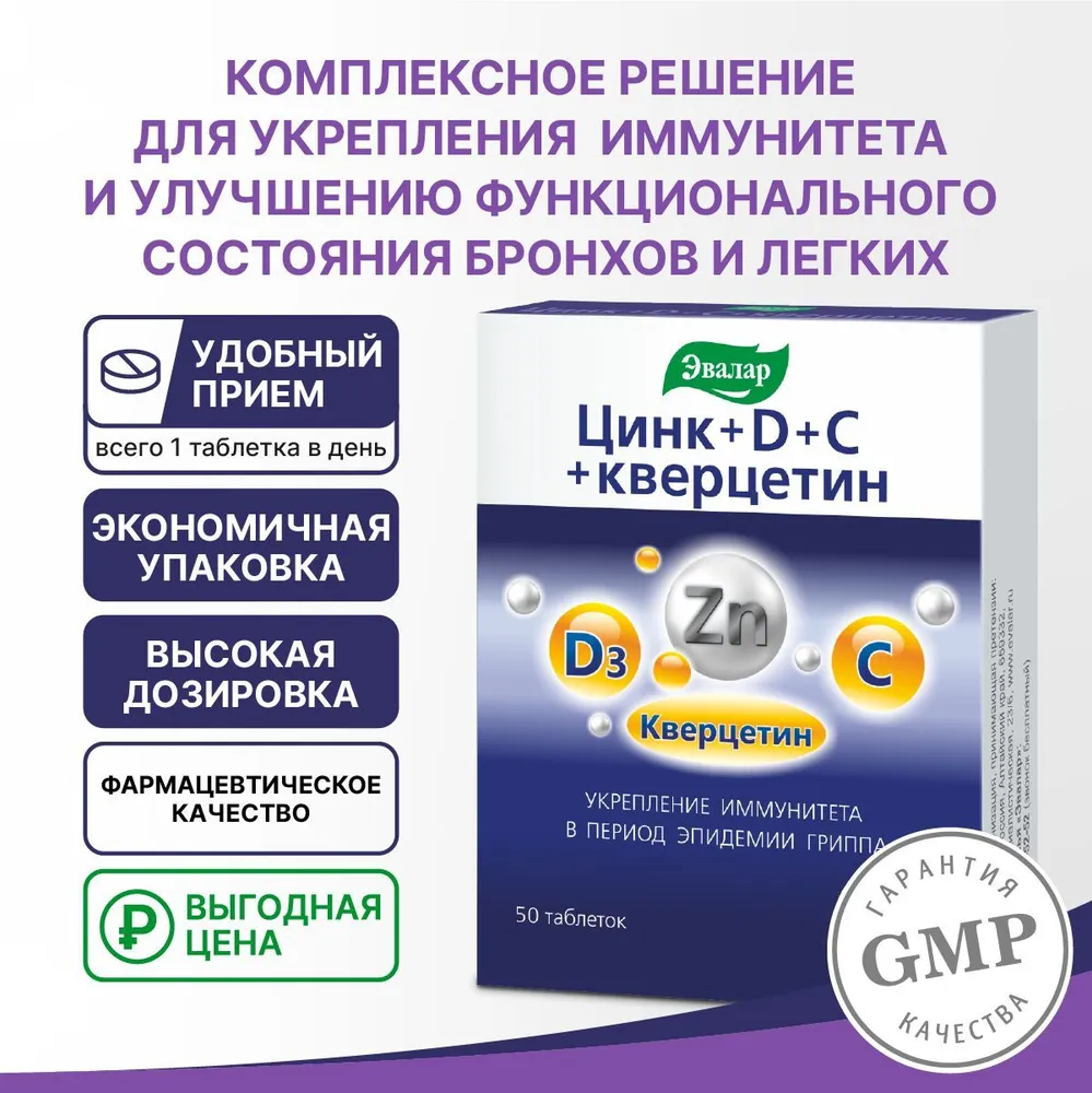 Комплекс Цинк+D+C+Кверцетин от Эвалар укрепляет иммунитет, помогает защититься от простуд и вирусов, поддерживает здоровье дыхательных путей и сосудов, а также обеспечивает антиоксидантную защиту организма.