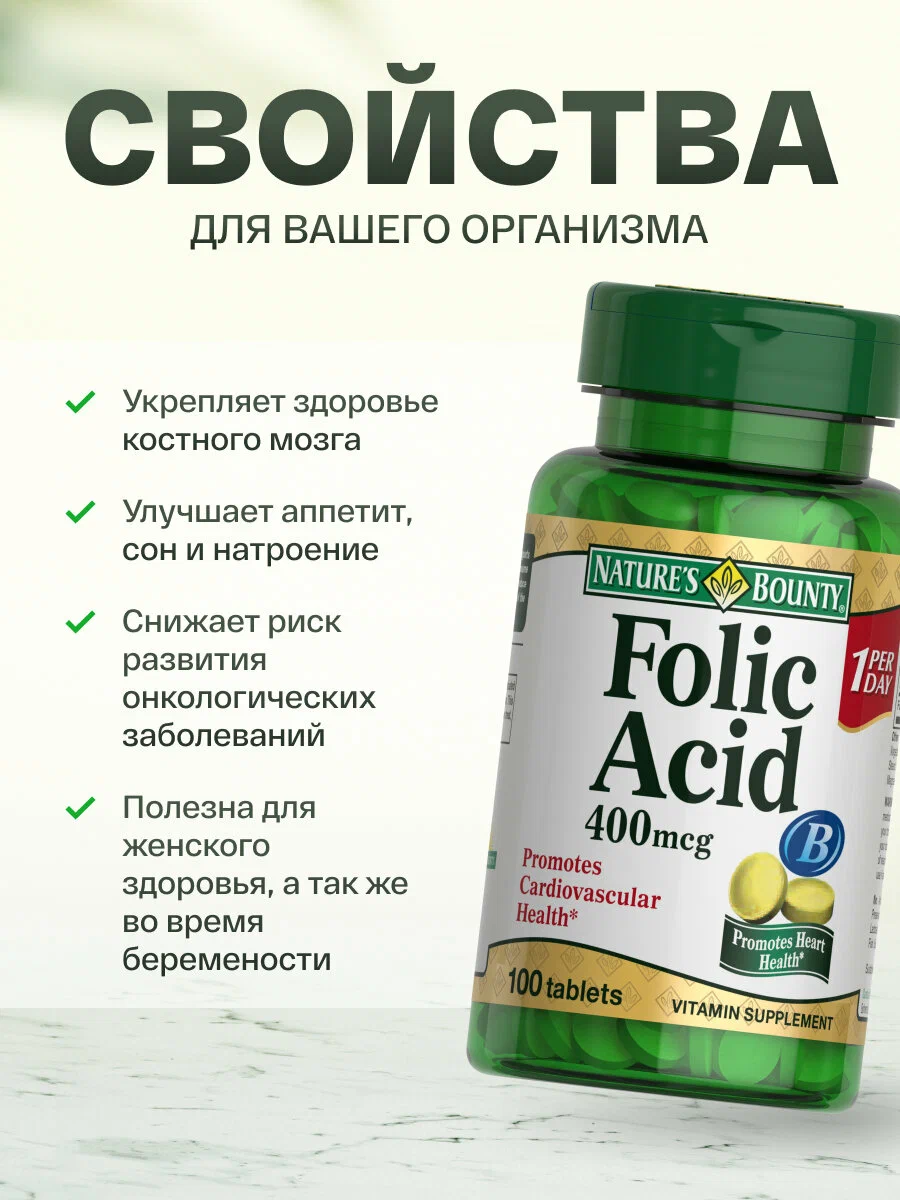 Nature's Bounty Фолиевая кислота 400 мкг — биологически активная добавка, которая поддерживает здоровье сердца, участвует в процессе кроветворения и особенно важна для женщин в период планирования беременности и во время беременности для правильного формирования нервной трубки плода.