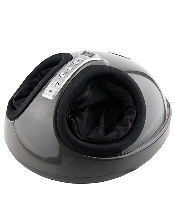 Электрический массажер, комбинирующий воздействие роликами и пневмо-компрессию для массажа ног с глубоким прогревом, прорабатывает структуры стопы и выводит скопившуюся жидкость.