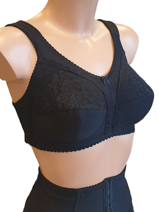 Т-образная конструкция чашечек. В обеих чашечках бюстгальтера имеются удобные хлопчатобумажные кармашки, предназначенные для фиксации протезов молочных желез. Высокая и изысканная линия декольте бюстгальтера позволяет скрывать следы хирургического вмешательства. Отделка из кружевного полотна и узких кружев, подчеркивающих фигурные линии кроя. Бретели усилены поролоновыми деталями в области плеча и регулируются по высоте, в соответствии с индивидуальной потребностью женщины. Объем бюстгальтера можно регулировать многоступенчатой застежкой на спине. Тщательно обработанные швы обеспечивают свободу движений, широкая и эластичная задняя часть бюстгальтера и удобные бретельки обеспечивают комфорт при использовании.