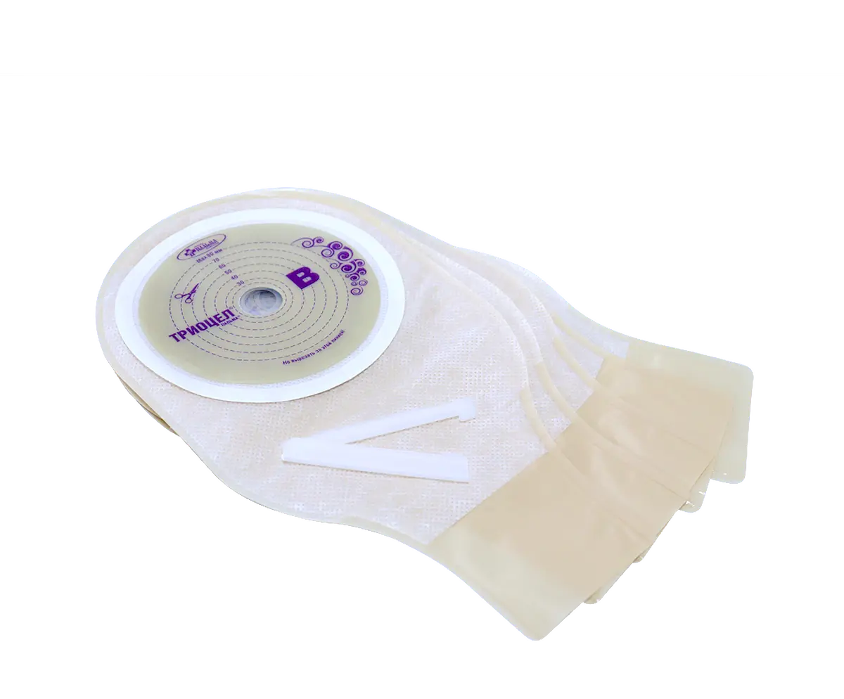 С внешней стороны калоприемники Триоцел Д выполнены из непрозрачной пленки телесного цвета. На стороне, прилегающей к телу - мягкая сетчатая подкладка из полимерного материала. Калоприемник может оставаться на коже в течение нескольких дней, не вызывая раздражения в месте крепления и обеспечивая комфортные условия для кожи вокруг стомы.