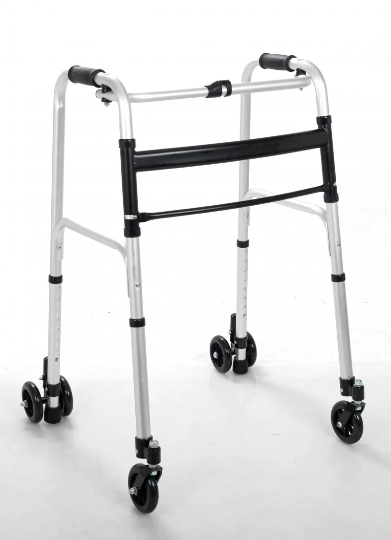 - Колеса: Четыре литых колеса диаметром около 20 см обеспечивают отличную проходимость как в помещениях, так и на улице (по асфальту или плитке). Передние колеса — самоориентирующиеся (поворотные), что делает роллатор маневренным.