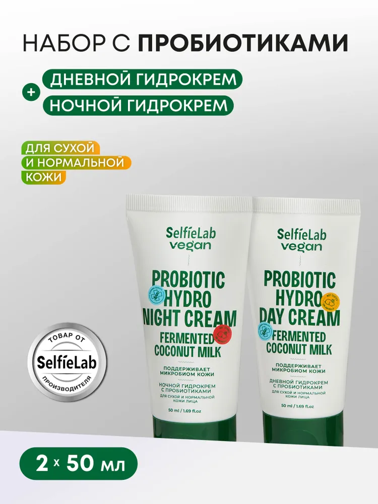 Подарочный набор Дневной и Ночной гидрокрем с пробиотиками для сухой и нормальной кожи лица, линия Vegan, товарный знак SelfieLab